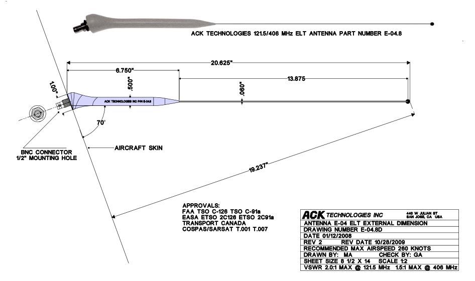 The antenna is suitable for external aircraft installation and is rated for operation at airspeeds up to 260 knots. This makes it appropriate for a wide range of general aviation aircraft where compliant ELT antenna performance is required.