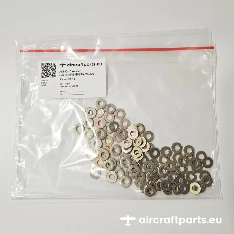 The AN960-10 washer, equivalent to NAS1149F0363P, is a standard flat washer used in certified aircraft assemblies to distribute load, prevent surface damage, and ensure proper fastening performance.