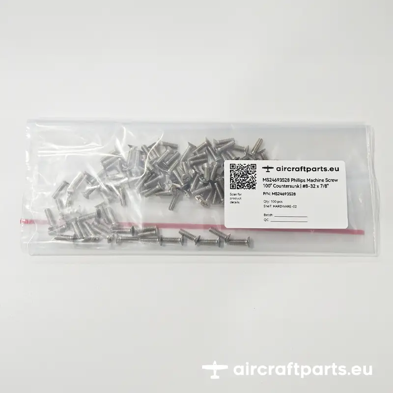 The MS24693S28 is a corrosion-resistant stainless steel machine screw featuring a 100° countersunk head and Phillips drive. Widely used in certified aircraft for flush-mounted installations, it provides reliable fastening in panels, avionics, and non-structural airframe applications.