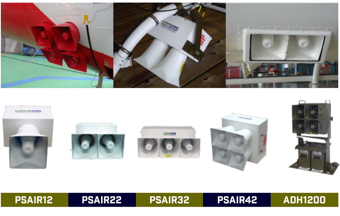 Power Sonix speakers are engineered to project extremely clear speech or siren sounds over the noise of engines, rotors, and other ambient conditions. Their systems provide the ultimate suite of features: minimal weight, very compact, compatibility with most cockpit audio controllers, high-efficiency Class D amplifiers, ability to input prerecorded messages, and a very competitive price.