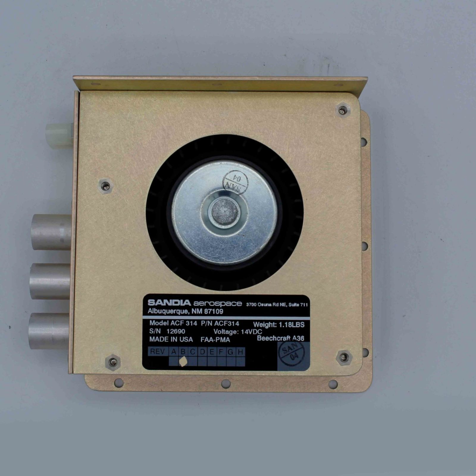 The Sandia ACF 314 is a 3-port avionics cooling fan designed for 14 VDC aircraft electrical systems, providing targeted forced-air cooling for panel-mounted avionics.